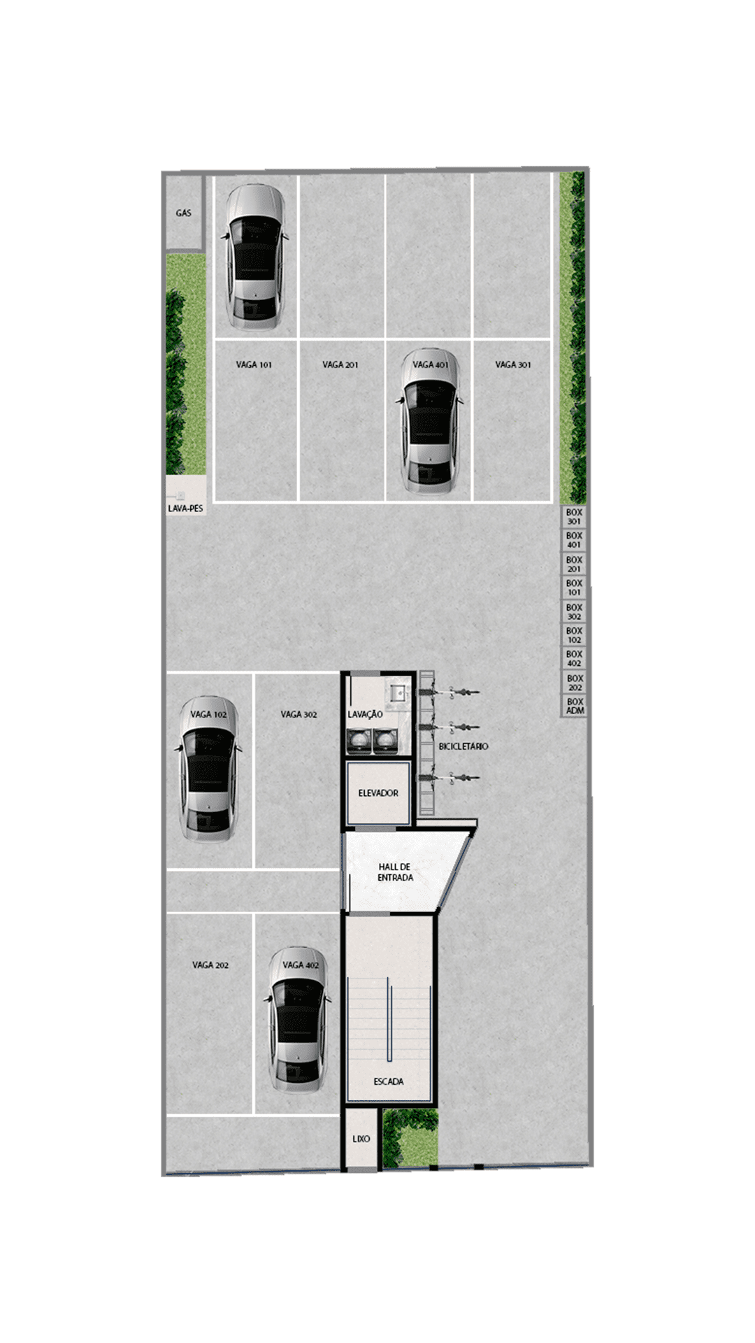 6 andares (4 pavimentos de apartamentos, térreo e cobertura com área de lazer)